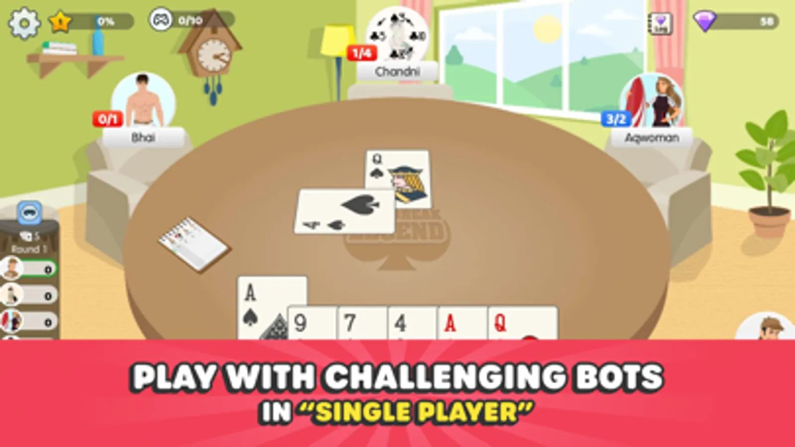 Play against other Callbreak enthusiasts all over the world no matter what your skill level.