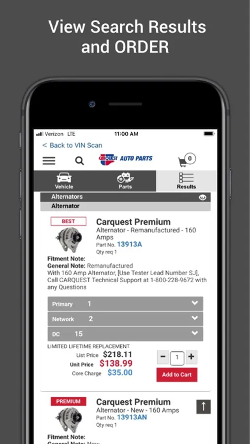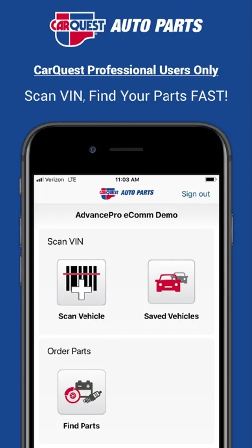 Carquest® Independent Customers can scan directly from a vehicle’s barcode (windshield or door mounted), search for parts, and order directly from the app using their secure Carquest Professional account.
