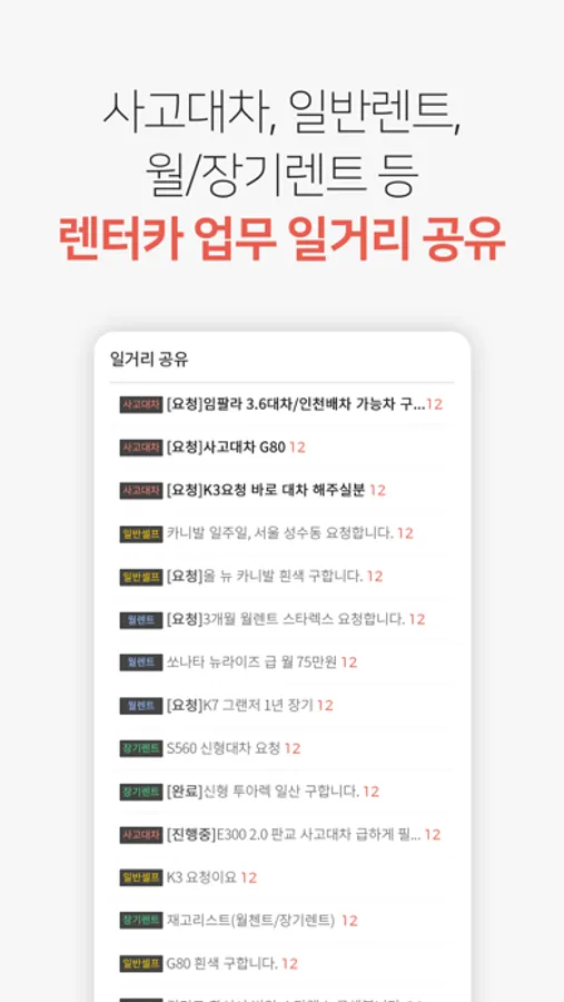 - 사고대차 요청은 물론 일반/셀프렌트, 월/장기렌트 등 다양한 일거리 공유 가능