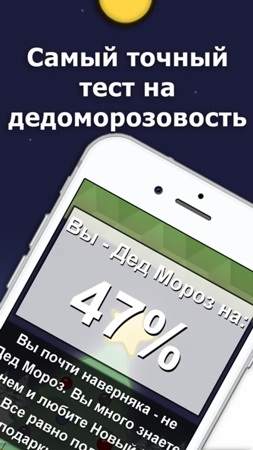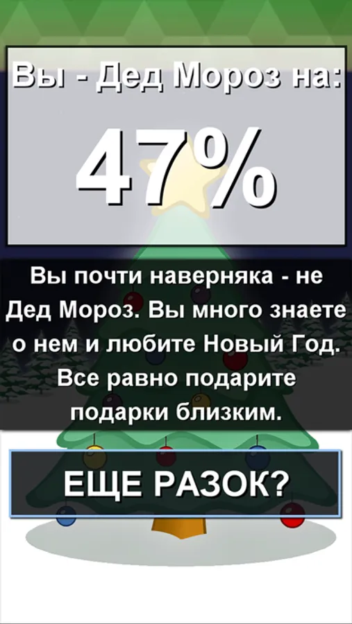 Тест проверяет именно вашу дедоморозовость, а не познания традиций нового года. Результаты подсчитываются максимально объективно (хоть и в шуточной форме), но приложение в первую очередь носит развлекательную функцию. Даже если по результатам теста - вы наверняка Дед Мороз, проконсультируйтесь со специалистом по дедоморозовости :-)))