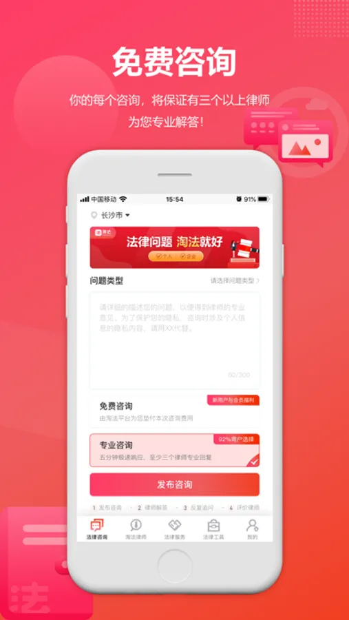 淘法系国内领先的互联网法律服务平台,有网站、APP、小程序、微网站。内容覆盖法律咨询、找律师、全套法律知识、法律文书和合同范本、企业信息查询、失信信息查询、法律法规查询、案例查询等全方位的法律服务。并通过律师评价和排名系统,促使平台律师尽可能的为老百姓提供优质的法律服务