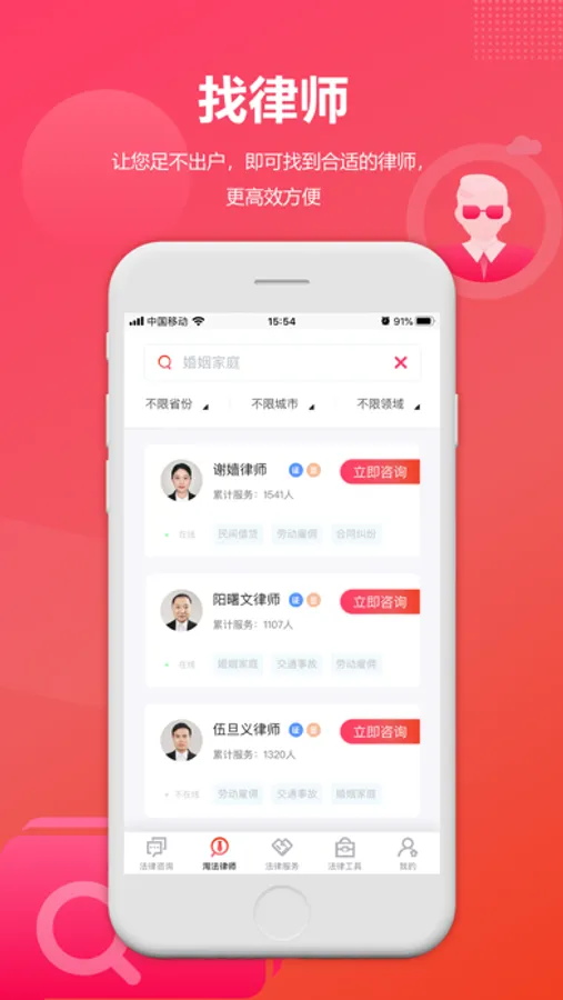 三、【找律师】淘法上有全国各地的海量律师供您选择,不但有律师简介、律师的专长、过往用户对律师的评价,更有海量的案源数据库让您真正知晓该律师所办过的案例和成功的经验,失败的历史,足够让您选择性价比更好的律师。