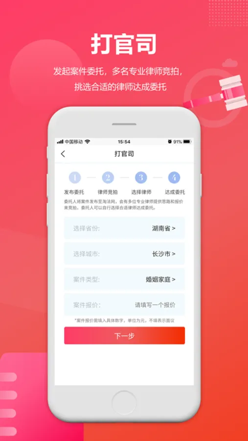 二、【案源竞拍】 淘法独创案源竞拍,变我要找律师为律师来找我。在淘法平台发布案源后,将有多个律师为您提交解决方案、收费模式等,供您选择。