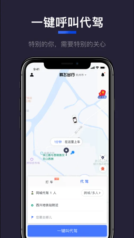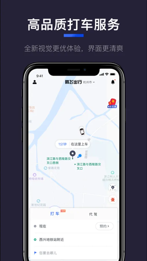 腾飞约车是一款集新出租车、代驾的APP,所在位置自动定位,按您的需求自动匹配您附近的服务人员。一键预约下单,师傅就在您身边,为您的精致生活起航。