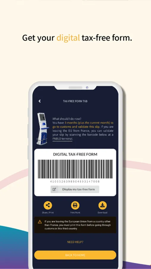 Scan your form at the electronic terminal (PABLO kiosk) to validate your tax-free status before leaving the European Union.