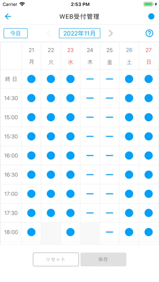 予約可能日時、診療メニュー、担当スタッフを入力すると、その患者様が受付できる枠が「○」で表示されます。