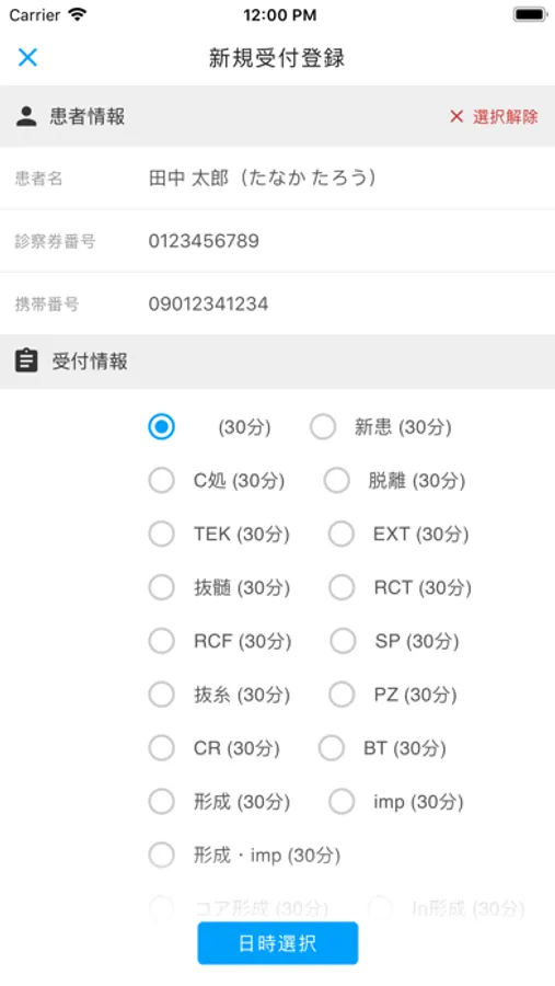 予約可能日時、診療メニュー、担当スタッフを入力後、患者様のメールアドレス、携帯番号に「日時のみ決定してください」という通知を送ることが出来ます。