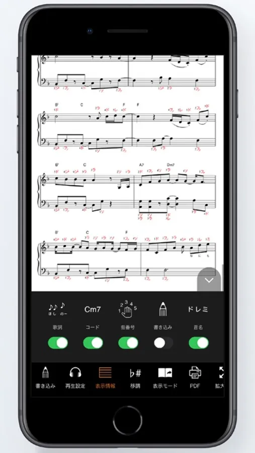 -Fingering, notes (Do Re Mi), lyrics, display or hide of codes