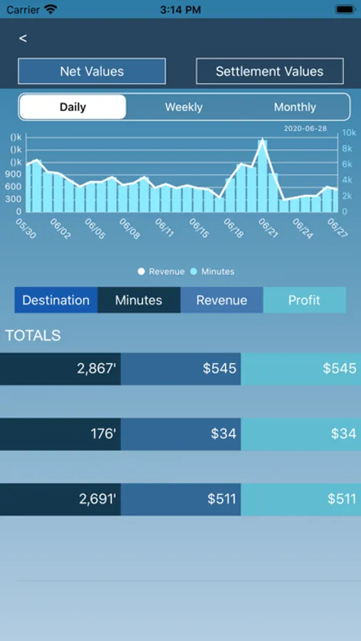 - A general view to see all the incoming and outgoing traffic (minutes and amount)