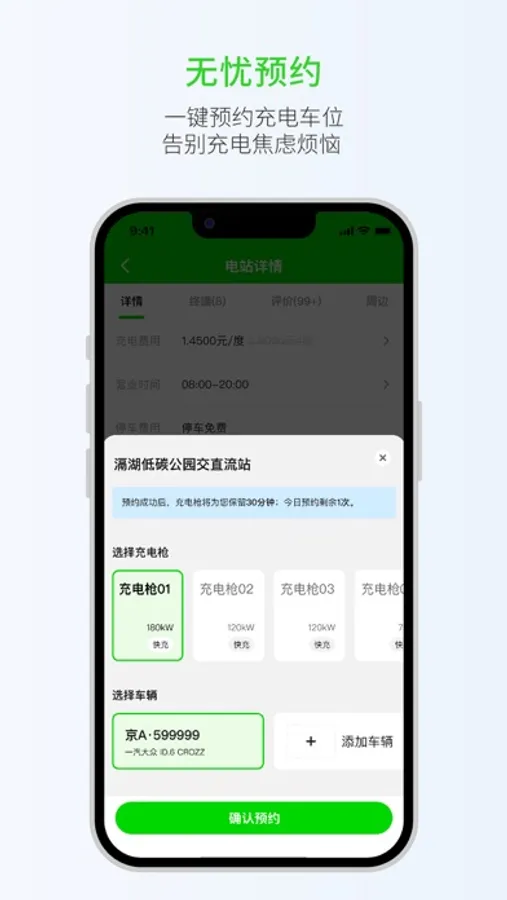 【预约充电零焦虑】可通过“开迈斯充电”APP一键预约充电车位,无需排队,不用担心抵达场站后没有充电车位,告别充电焦虑