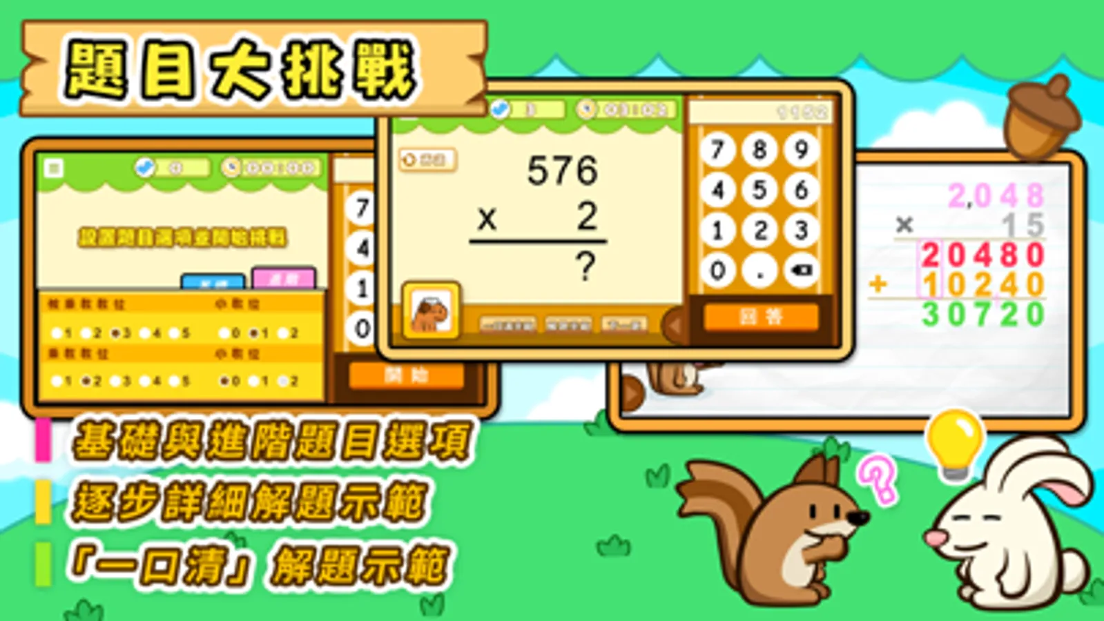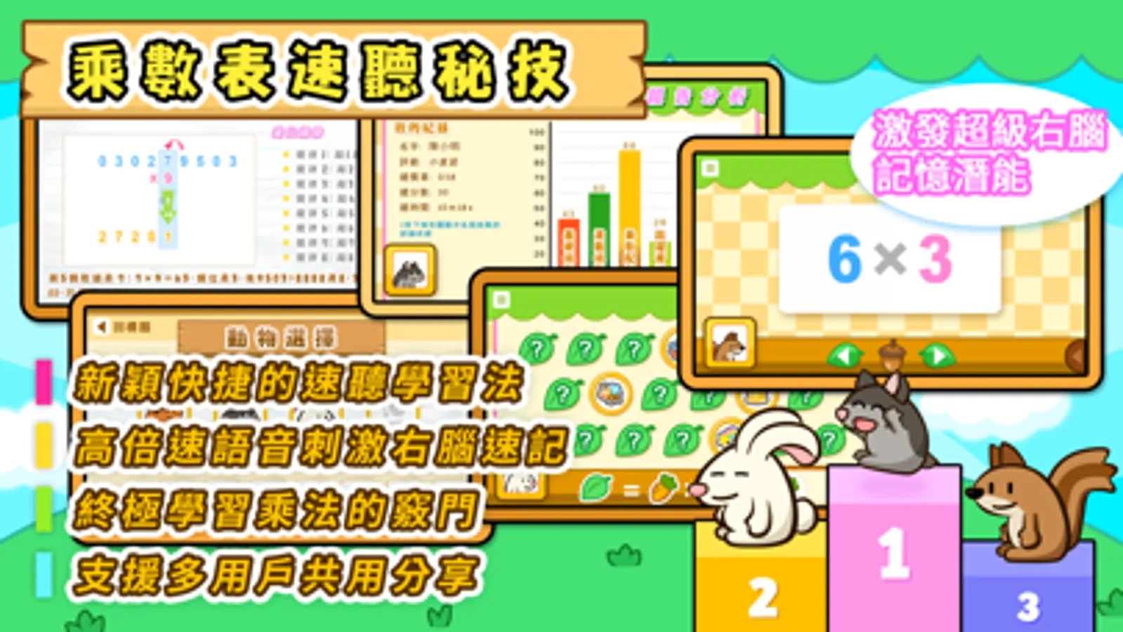 針對個人的強弱項自訂題目,全面的選項覆蓋各類型的乘法,不重覆及源源不絕的隨機題目有助提升學習的興趣,同時支援國語,粵語語音的聽算挑戰選項。