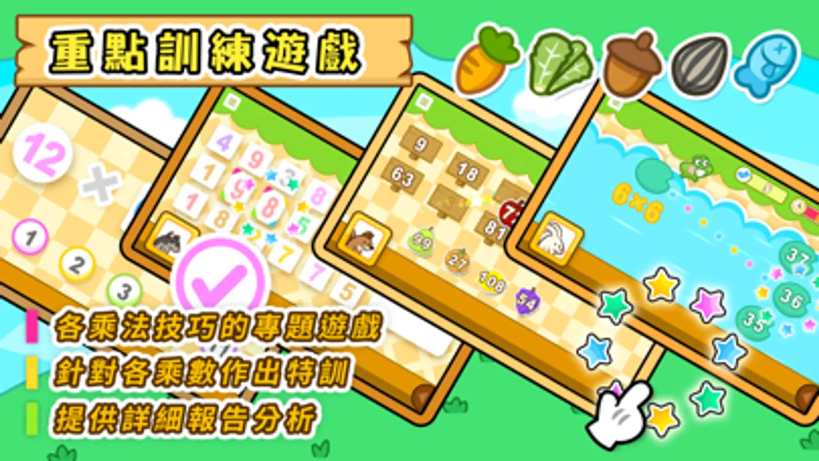 針對不同的乘法技巧,特設多款生動有趣的互動專題遊戲,各遊戲除了吸引兒童的注意力,亦鼓勵他們領會學習數學的箇中樂趣,從而幫助深化他們對乘法的各類知識。