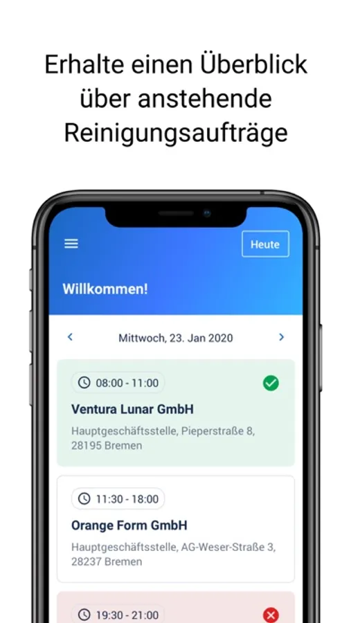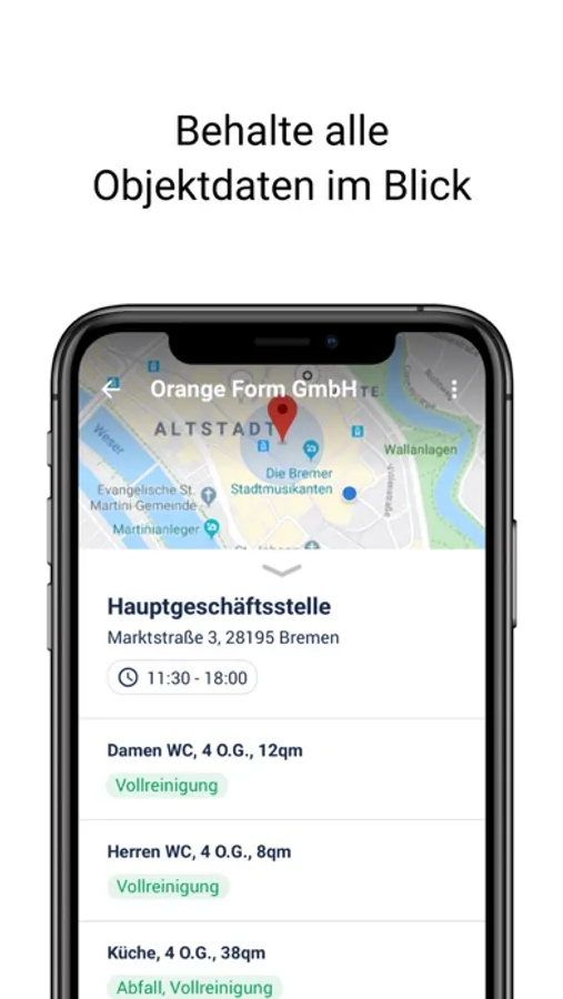 In der Anwendung werden alle zugewiesenen Arbeitsaufträge übersichtlich pro Objekt dargestellt, so dass Du auf alle erforderlichen Informationen direkt mit dem Smartphone zugreifen kannst. Zusätzlich kannst Du Deine geleisteten Arbeitsstunden ganz einfach in der App eingeben, damit keine Zettelübergabe für die Abrechnung notwendig ist.