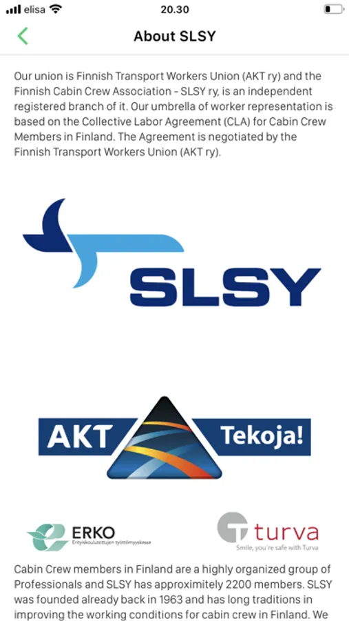 SLSY is an independent registered branch of the Finnish Transport Workers Union (AKT ry). Our umbrella of worker representation is based on the Collective Labor Agreement (CLA) for Cabin Crew Members in Finland.