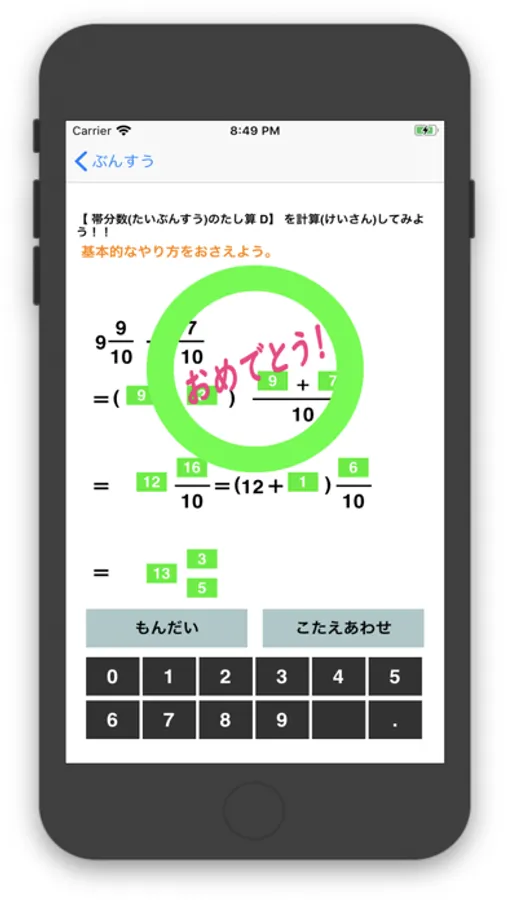 「分数の算数計算」の虫食い穴埋め問題トレーニング「ぶんすうくん」です。シンプルな作りですが、分数計算の基本はこれで完璧!!小学校低学年から高学年まで幅広く使えると思います。中学生や高校生・大人でも、分数計算が苦手な人はコレで苦手意識を克服できるでしょう。。。学年が上がれば、帯分数にいちいち直さなくても仮分数のままで構わないのですが、小学生のうちははやっぱり「帯分数に直す」トレーニングも大事ですね。。。ぜひこの算数アプリで「ぶんすう」を楽しんでください!!