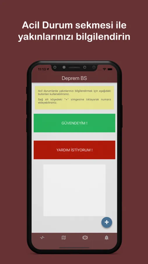 Acil durum sekmesi ile bir doğal afet sırasında, eklediğiniz 3 numaraya lokasyon bilginizi ve durumunuzu gönderebilirsiniz.