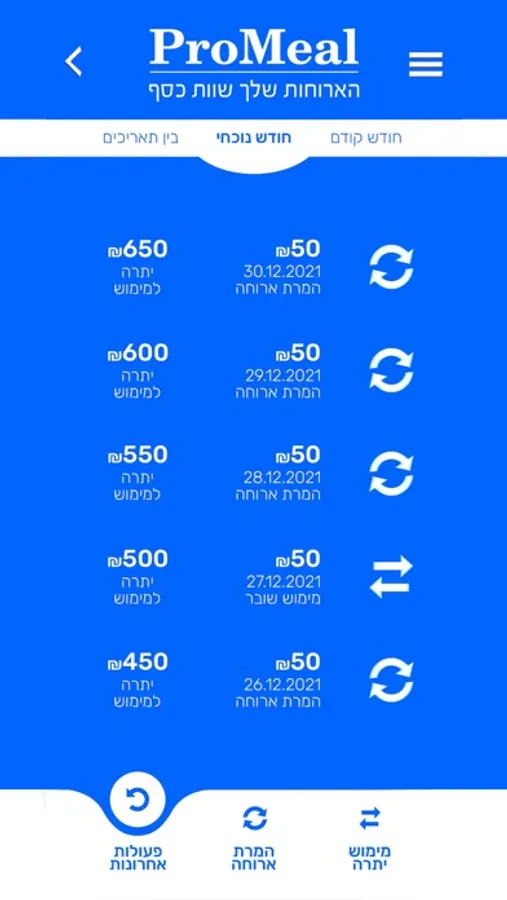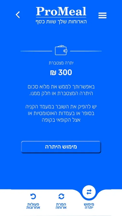 תקציב הארוחה היומי שלך לא נוצל? מהיום הארוחות שלך שוות כסף ואתה יכול לצבור אותו כל יום מחדש ולממש את סך הסכום הנצבר לבחירתך ברשתות יינות ביתן, מגה, מהדרין ועוד...
