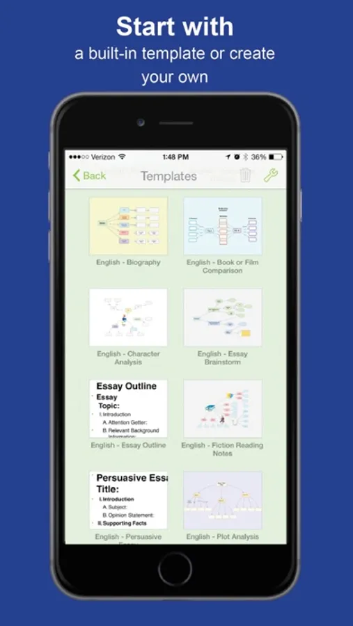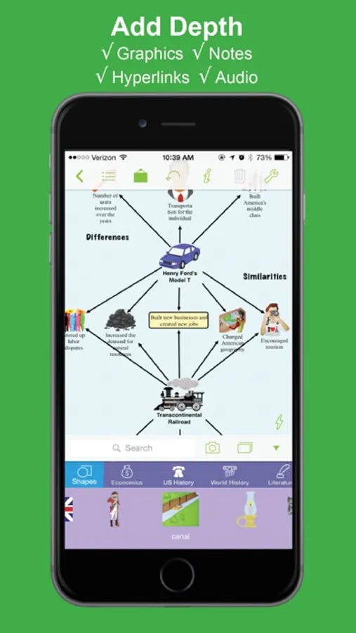 Create concept maps, cause and effect diagrams, process flows, family trees and more! Getting started couldn’t be easier: Simply double tap a blank space on your canvas to create a new idea symbol. Start from scratch or from one of the many built-in templates in language arts, history, science or thinking & planning!