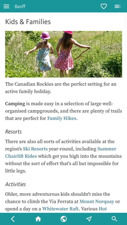 History & Culture; Kids & Families; Mountain Biking; and Rafting all have their own sections too, while an extensive Skiing & Snowboarding section covers all Canadian Rockies resorts, its Cross-Country Skiing opportunities and many Heli-Skiing providers to make planning a winter trip easy.