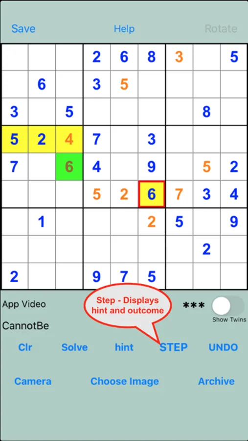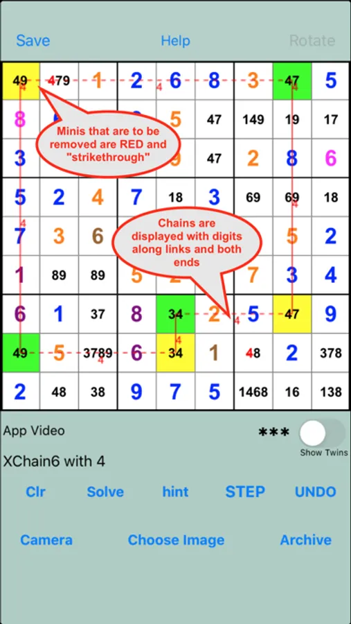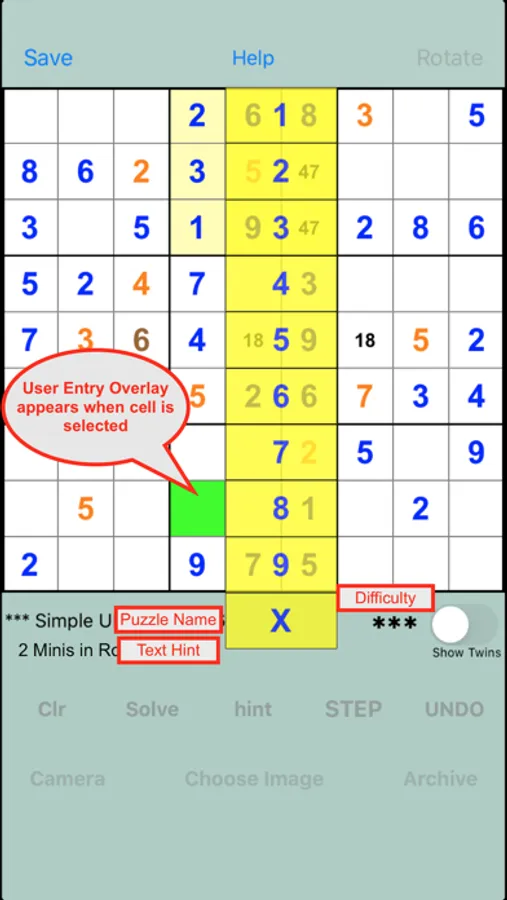 HELP screens describe each method and include "screen shot" examples and the logic behind each method . One level of "UNDO" assists with "seeing what happened". And TWINS are optionally displayed for those puzzlers familiar with this solving technique.
