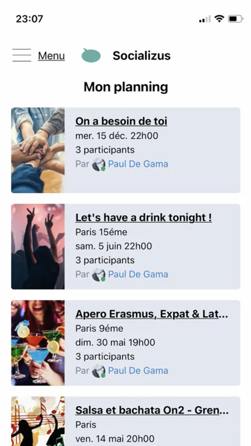 L'application SOCIALIZUS permet de participer, de partager ou de proposer et créer des activités pour se rencontrer dans une ambiance amicale. Pour les participants, c'est l'opportunité de découvrir différentes activités ou de faire des échanges linguistiques, pour les organisateurs, c'est une nouvelle façon de faire connaître ses événements et de créer une discussion instantanée ou un chat de groupe avec les participants avant l'activité pour répondre au question et se retrouver plus facilement et se géolocaliser sur mobile.
