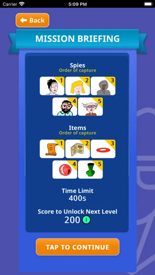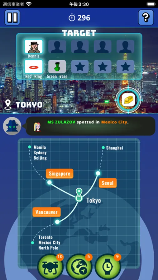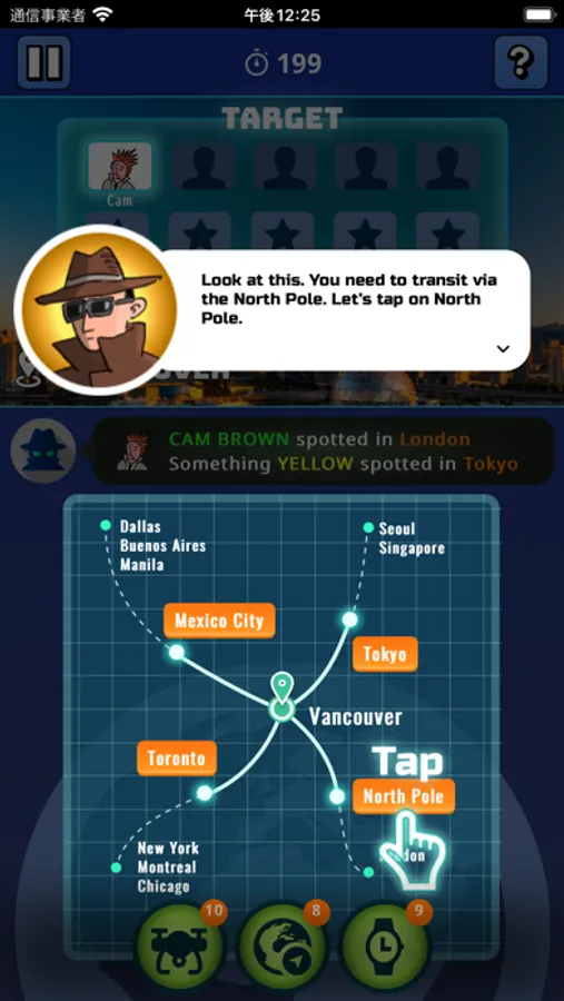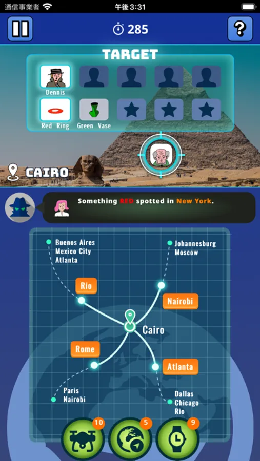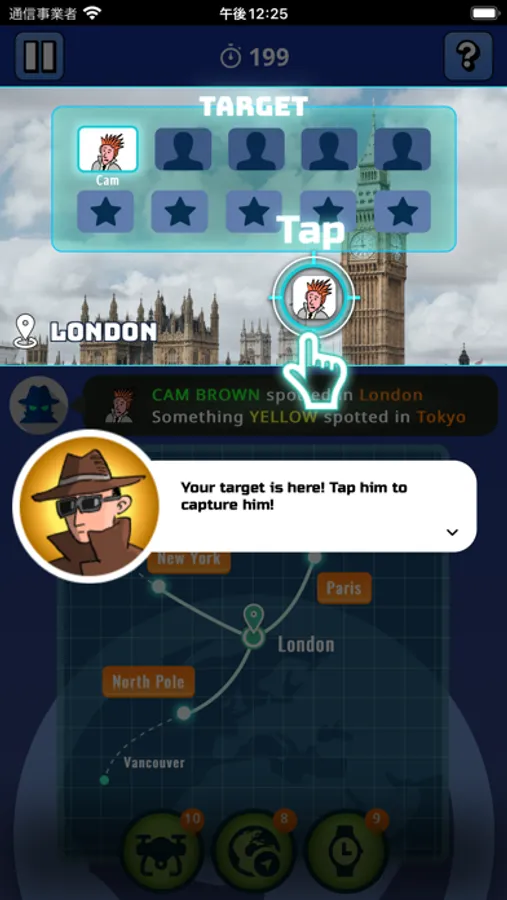Your targets are indicated at the top of the screen. Tap the name of a city on the map to move there, and if you find your target spy or item there, tap on the target to capture it.