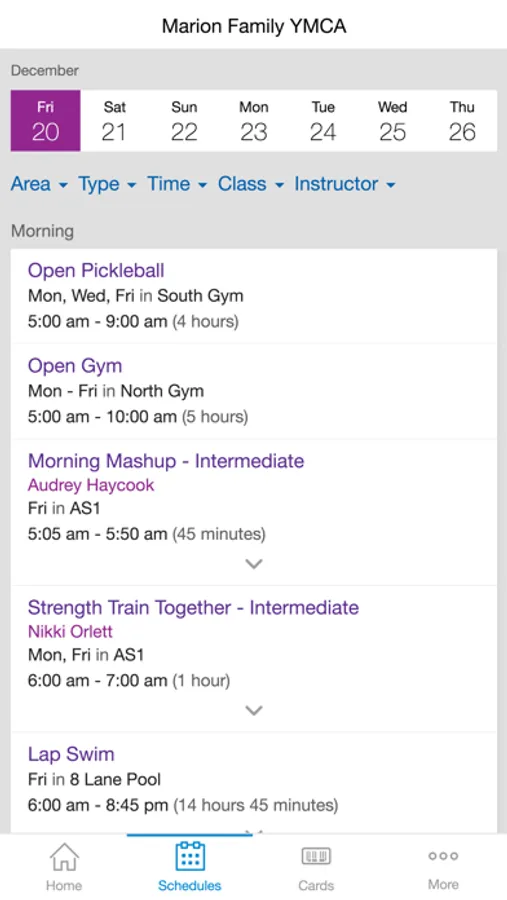 • Easily view schedules for each day and filter for the types of classes that you like.