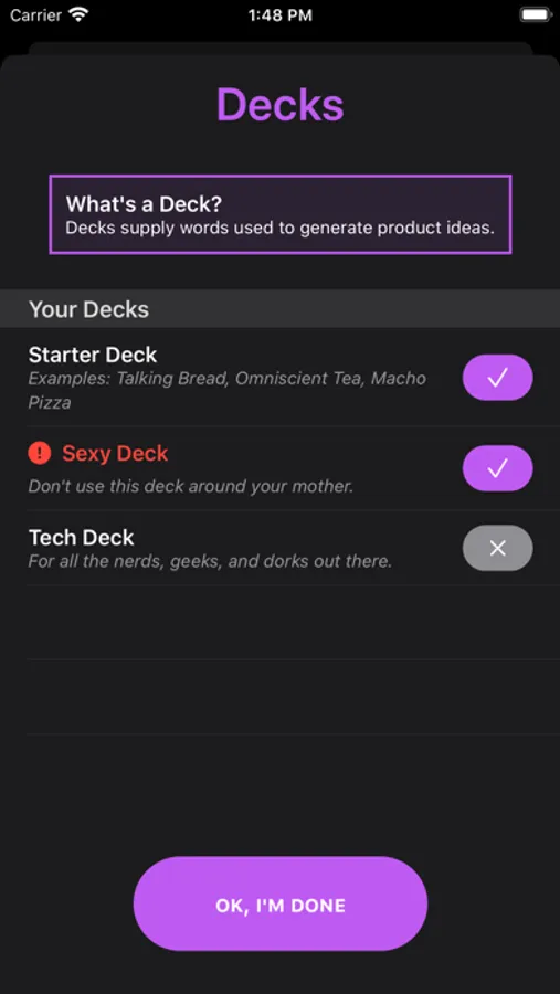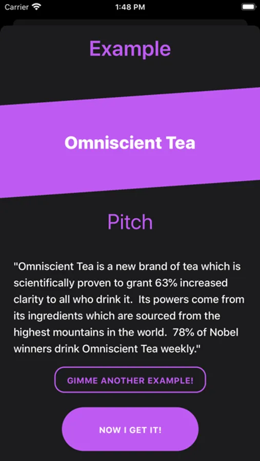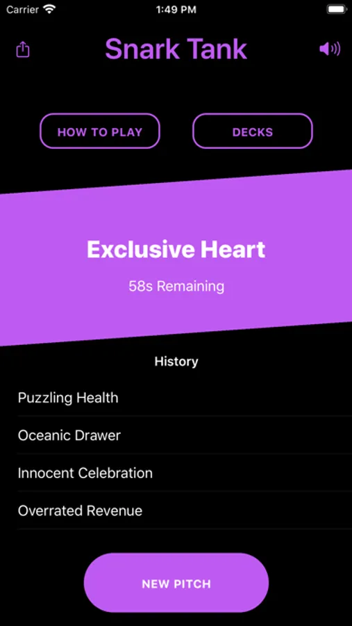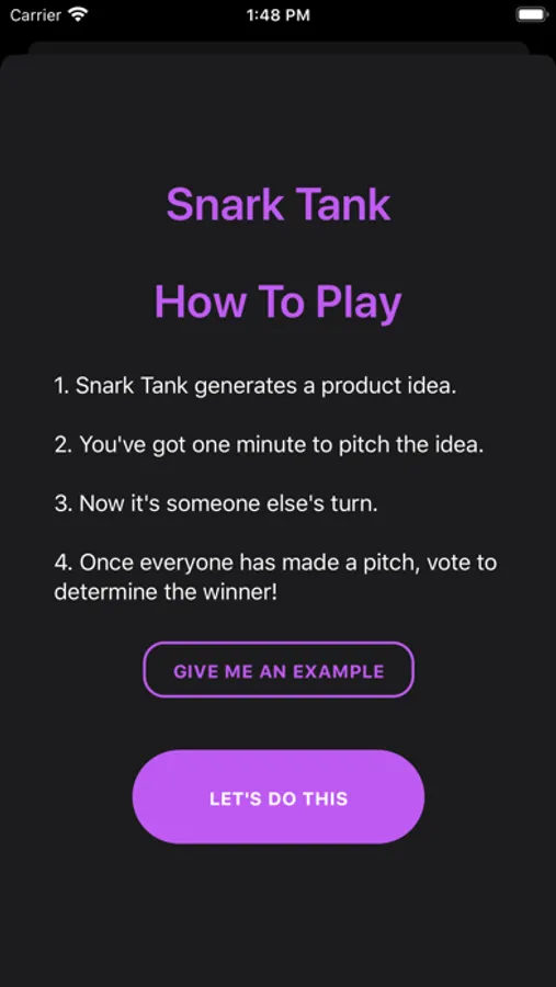 First, a product idea is generated (Examples: Cursed Poetry; Knife Surgery; Actual Disaster). You've now got sixty seconds to pitch the idea to your friends.