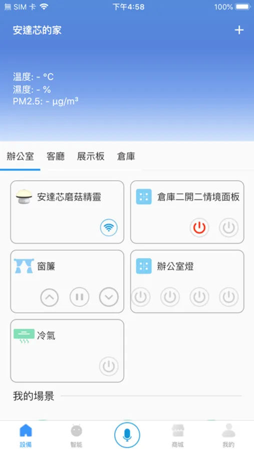 安達芯智能APP加上磨菇精靈不僅可以控制這些設備, 更可以整合其他設備, 如電動窗簾,電動鐵捲門. 自動泡茶機..等裝置, 實現全智慧的家居及辦公室