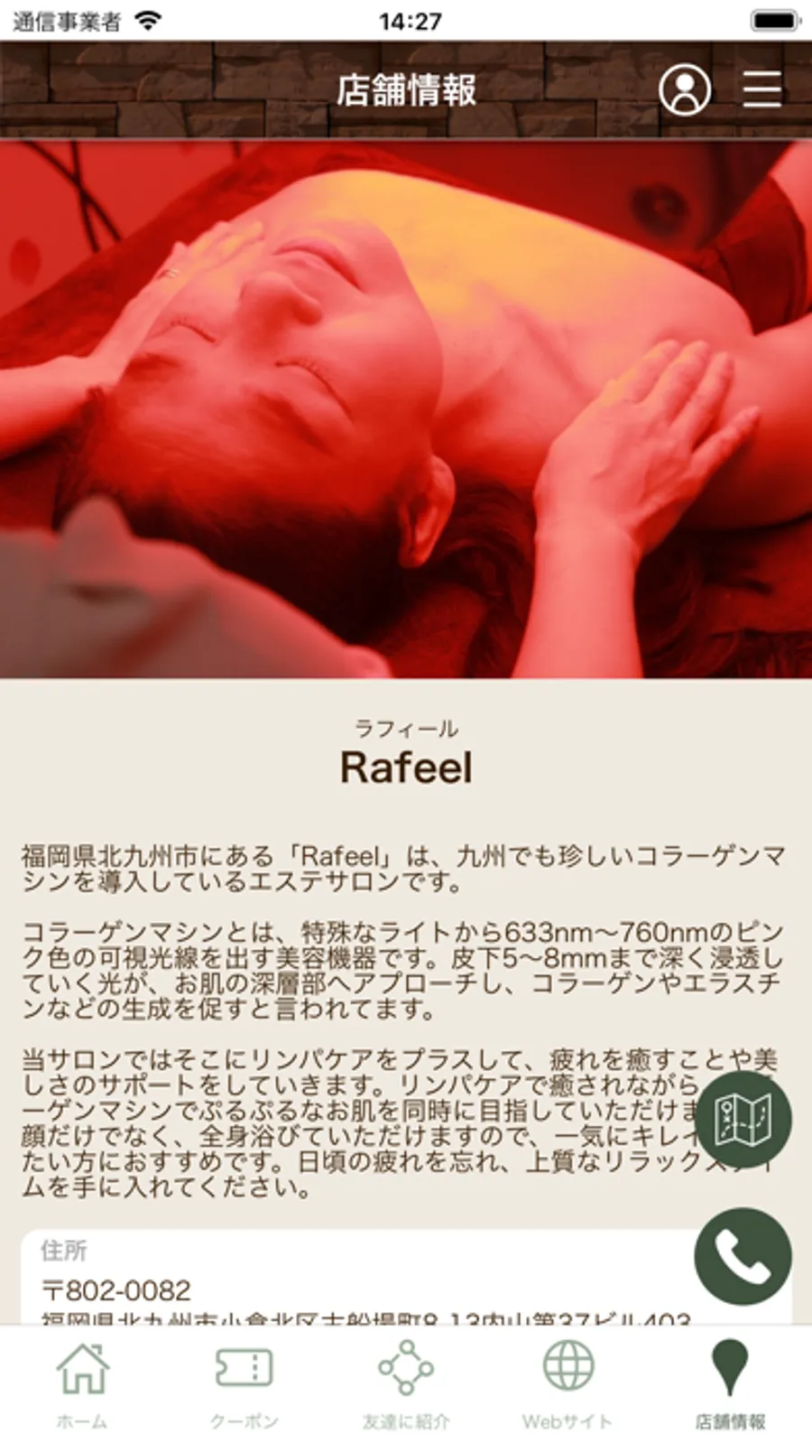 福岡県北九州市のRafeelの公式アプリが登場。アプリを通して『Rafeel』の新着情報やお得な情報をリアルタイムで受け取ることができます。また、いつでもお手元のスマートフォンから、メニューや、ご希望のお時間帯のチェック・ご予約などが可能です。アプリをインストールしていただくことにより『Rafeel』を、より便利に身近にご利用していただけます。