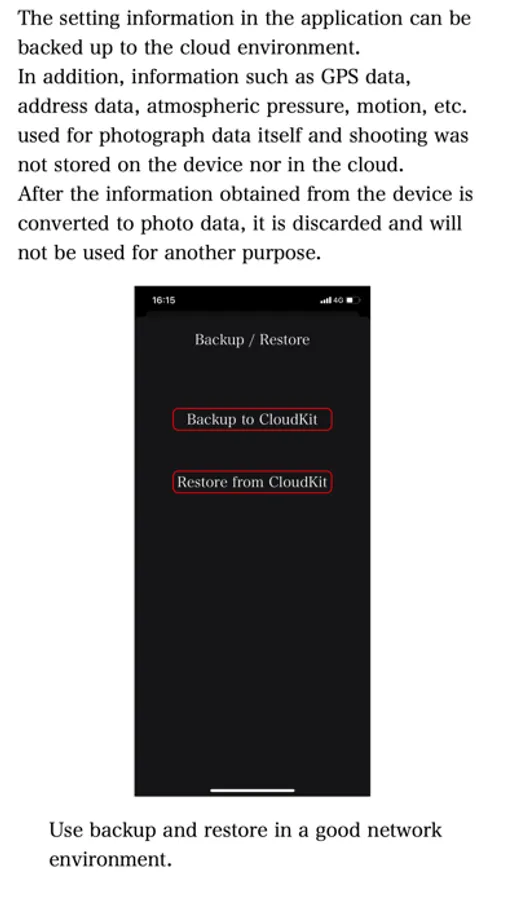 - This app stores photo data in the device's standard photo library. Only setting information is stored in the app itself and the cloud environment.