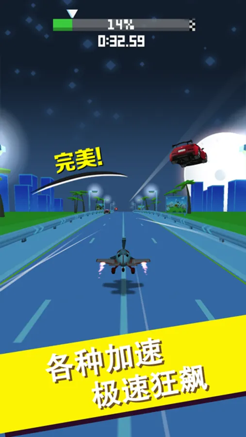 追求的是极度简单的操控,撞飞对手的爽快,一路狂飙的速度感,也可以通过跳板车做些飞车特技动作,通过加速带再加速~ 是的,就是不断加速就好,这个游戏就没有设定减速……