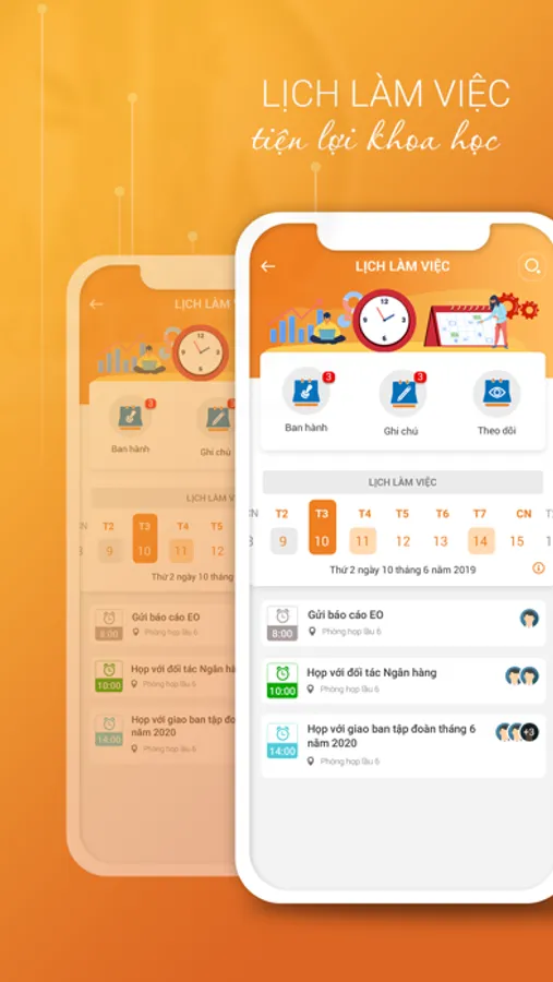 - Lịch làm việc: quản lý các công việc cá nhân, cập nhật lịch, tổng hợp lịch hằng ngày, tạo ghi chú. Tra cứu lịch làm việc của lãnh đạo và các nhân viên khác.