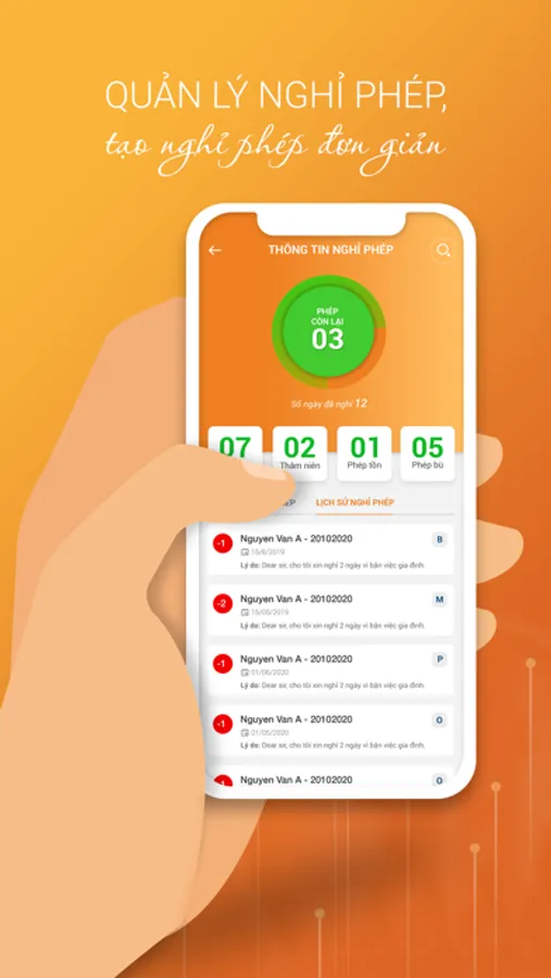 - Nghỉ phép: Giúp chúng ta tạo phiếu nghỉ phép, công tác ngoài, nghỉ bù, lưu trữ các thông tin nghỉ phép đã tạo. Cung cấp thông tin ngày phép cho người dùng: tổng số ngày phép, số ngày đã nghỉ, số ngày phép còn lại.
