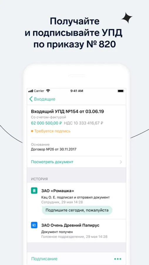 Проверяйте основную информацию по сделке, историю и комментарии перед подписанием документа. Просматривайте печатную форму документа.