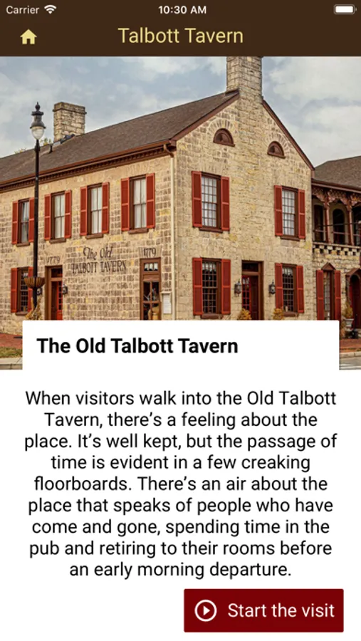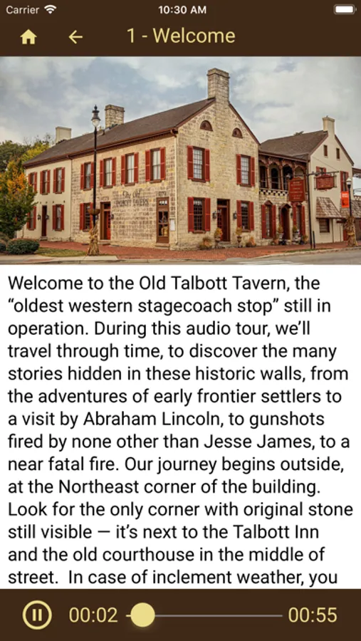 Welcome to the Old Talbott Tavern, the “oldest western stagecoach stop” still in operation. With this audio tour, we’ll travel together through time, to discover the many stories hidden in these historic walls, from the adventures of early frontier settlers to a visit by Abraham Lincoln, to gunshots fired by none other than Jesse James.