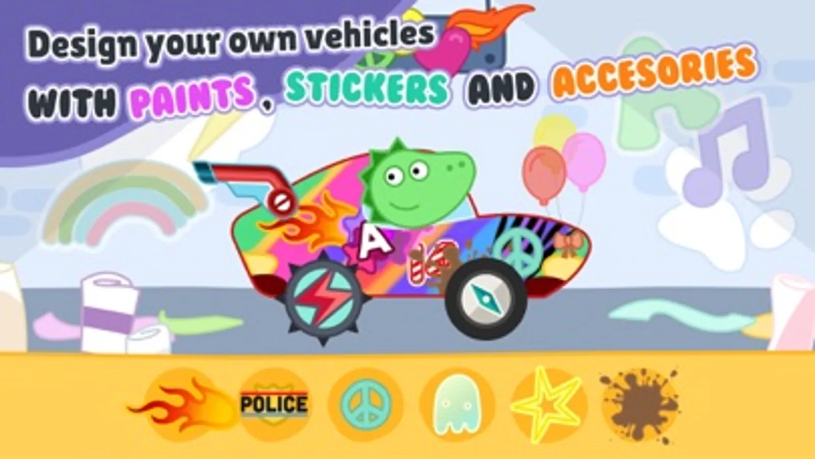 Players can select their favorite character and create amazing cars from the garage. Bebo, Pat, Zacky and Nina are the characters that will accompany them during the game while they paint and color the cars and avoid obstacles in the race.