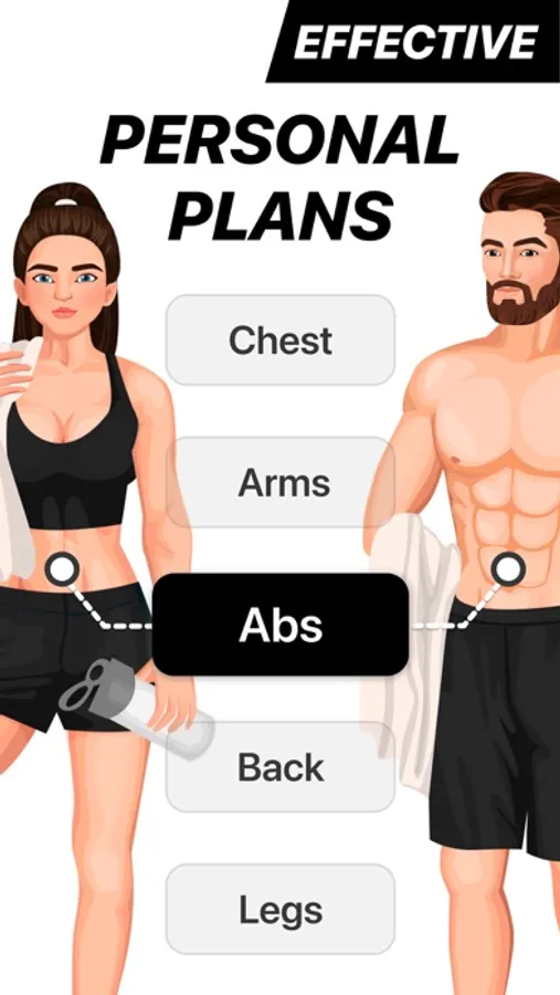 Individual programs based on your height, weight, age, gender, goal, etc. Perfect for both men and women. Select the problem area: Arms, Belly, Legs, Butt, Back. We'll build the program specifically for you.