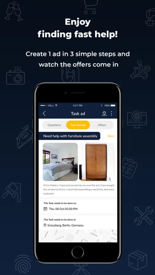 Create your FREE task ad in less than 1 minute, with a description, location, and budget. Then, sit back and watch the offers come in!