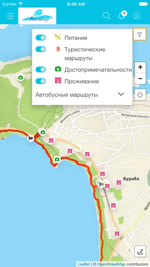 На карте отображаются достопримечательности, туристические маршруты, места проживания и заведения питания. Можно использовать фильтр чтобы отобразить только нужный тип объектов. Так же есть список автобусных маршрутов.