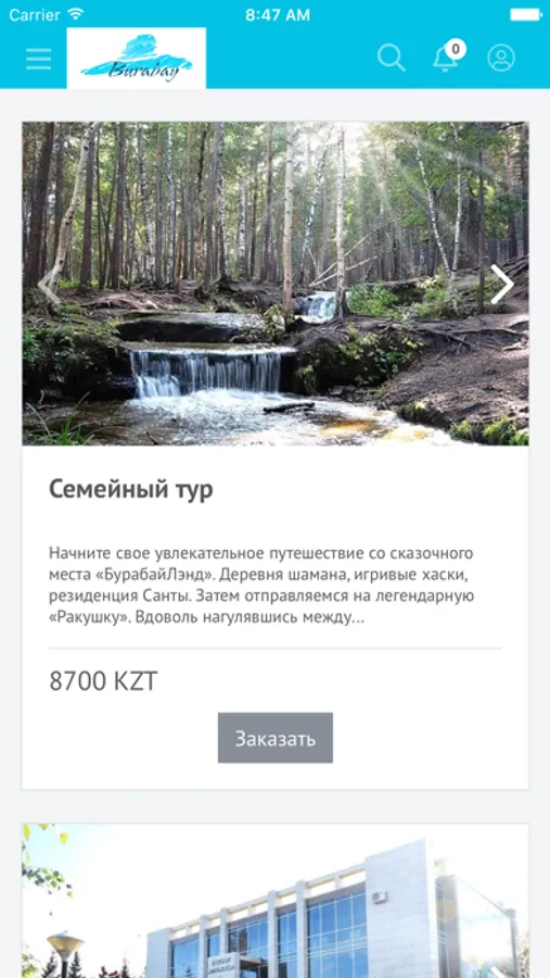В каталоге туров выводится список карточек по каждому туру. Каждая карточка содержит название тура, краткое описание, цену, и слайдер с изображениями. Нажав на кнопку «Заказать», можно перейти на страницу тура.