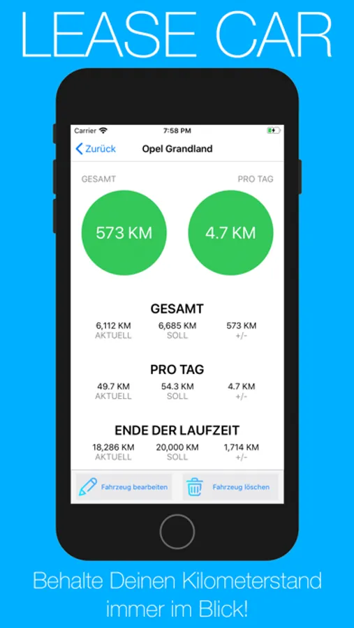 Mit LeaseCar hast Du nicht nur den Kilometerstand Deines Fahrzeugs im Blick, LeaseCar zeigt Dir auch sofort an, ob Du mit Deinen gefahrenen Kilometern innerhalb Deiner Grenzen bleibst oder Du sie überschreitest. So kannst Du jederzeit abschätzen wie weit Du mit Deinem Fahrzeug noch fahren kannst.