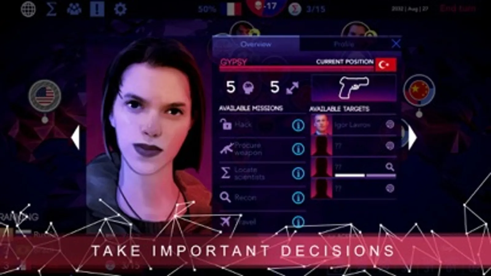Dynamic narrative: Develop and manage your relations with over 100 NPCs: lobbies, armed groups, politicians… Alliance, deception or assassination, you choose.