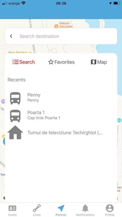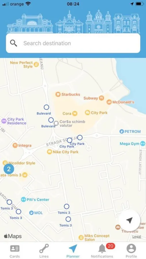 The traveler can start the journey from the current location or from another location on the map and can choose their destination by looking for an address, a point of interest, a desired station or even placing a pin on the map. They can also choose a location they have previously searched for or added to favorites.