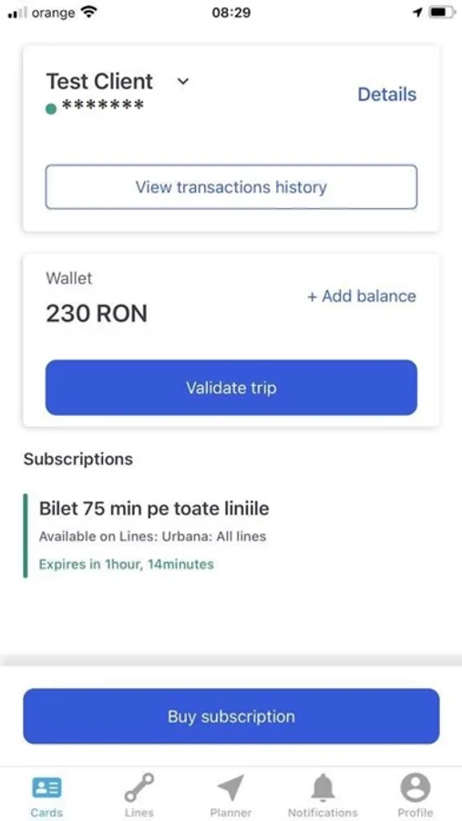 After creating an account and associating it with a transport card, the user can recharge the card with travel tickets directly in the application, using online payment by bank card or electronic wallet. The user can check the status of the card and the active travel tickets at any given time.