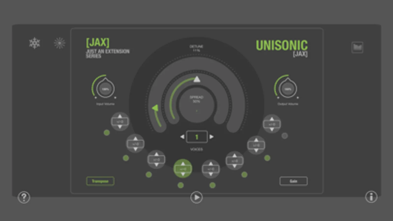 JAX Unisonic is a special Audio Unit, able to produce up to 8 additional voices from any audio input (also polyphonic audio) by multiplying and shifting it in pitch and other parameters. Audio Units require a host application for operation.
