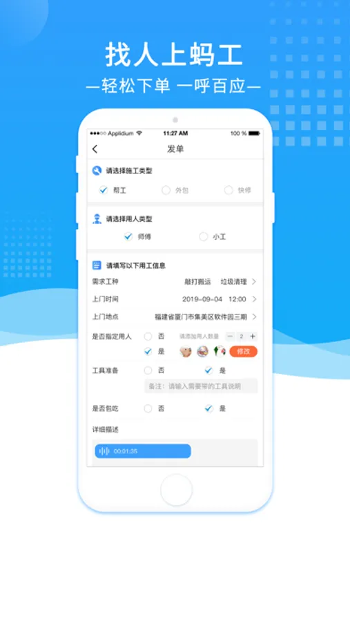 蚂工是一款致力于建筑及装修行业的综合性信用找人服务平台,平台集普通业主、装修公司、建筑公司、师傅、小工、临时工于一体,为彼此的用人和接活提供信息对接和资金托管。找人上蚂工!找活上蚂工!蚂工,让雇主有人帮,找好人,更轻松!让师傅有活干,钱好拿,受尊重!------功能特色------1.【蚂工装修】实力企业,随您挑选。不论您是要新房装修、旧房改造、酒店别墅设计还是公共设施建设,在这里,您都可以找到相对应的企业。基于地理位置的信息展现,让您足不出户就可以看到您当地附近的目标企业。找设计?找监理?一键提交申请,专业人员快速响应!2.【蚂工找人】轻松下单,一呼百应。不论您是家里需要叫人小修小补,还是人手不够需要叫人帮忙赶工期,还是工程项目需要找人外包,亦或是需要临时工帮忙凑场,在这里,您都可以找到合适的人选。从建筑敲打到居家换锁,工种繁多,满足您的日常需求。无论师傅、小工,均都实名认证,责任追责至人。资金平台托管,验收满意了才打款!3.【蚂工接单】自定推送,接单不愁。不论您是从事水电、泥水、木工、油漆还是搬运等其他工种,不论您是师傅还是小工,只要您有时间,有本事,有想赚钱的心,在这里,您都可以接到适合您的订单。基于自定范围的订单推送和语音实时播报,让您无时无刻都可以感受到机会的存在,从而实现快速接单。资金平台托管,防止光干活拿不到钱的现象,让师傅接活省心,拿钱安心!------联系我们------官方网站: www.magong.tech客服电话:400-088-8368今日头条:蚂工