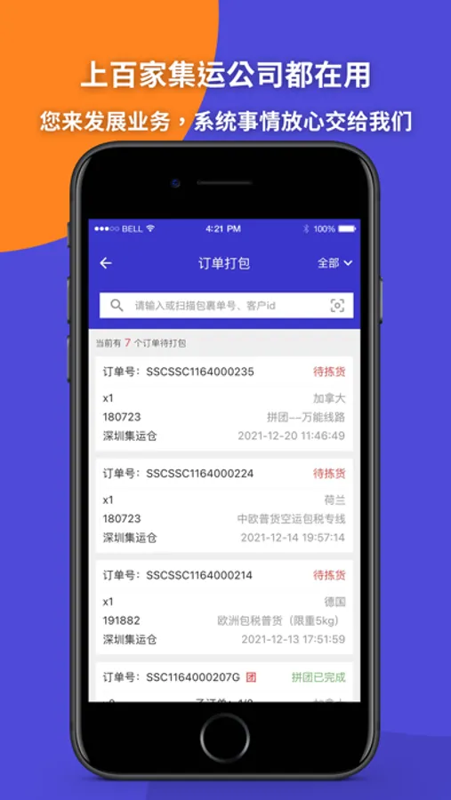 专业集运转运系统,提供高效、迅捷的打包、拣货、发货操作服务,为集运企业奠定坚实的基础