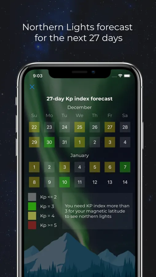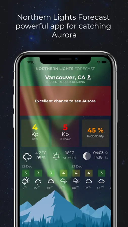 Northern Lights Forecast - a powerful app for catching Aurora! It will determine your location and, based on magnetic latitude, set the necessary notification settings. And as a result, in an efficient way, you will get alerts exactly at the right moment, when northern lights filled the sky!