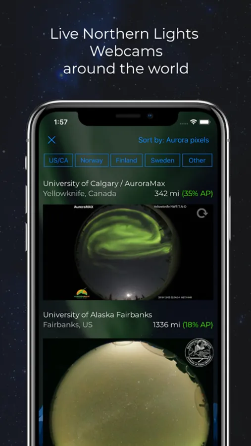 In the app, you can sort these webcams by distance from you or "aurora pixels", this is unique feature that detects the northern lights on webcams!